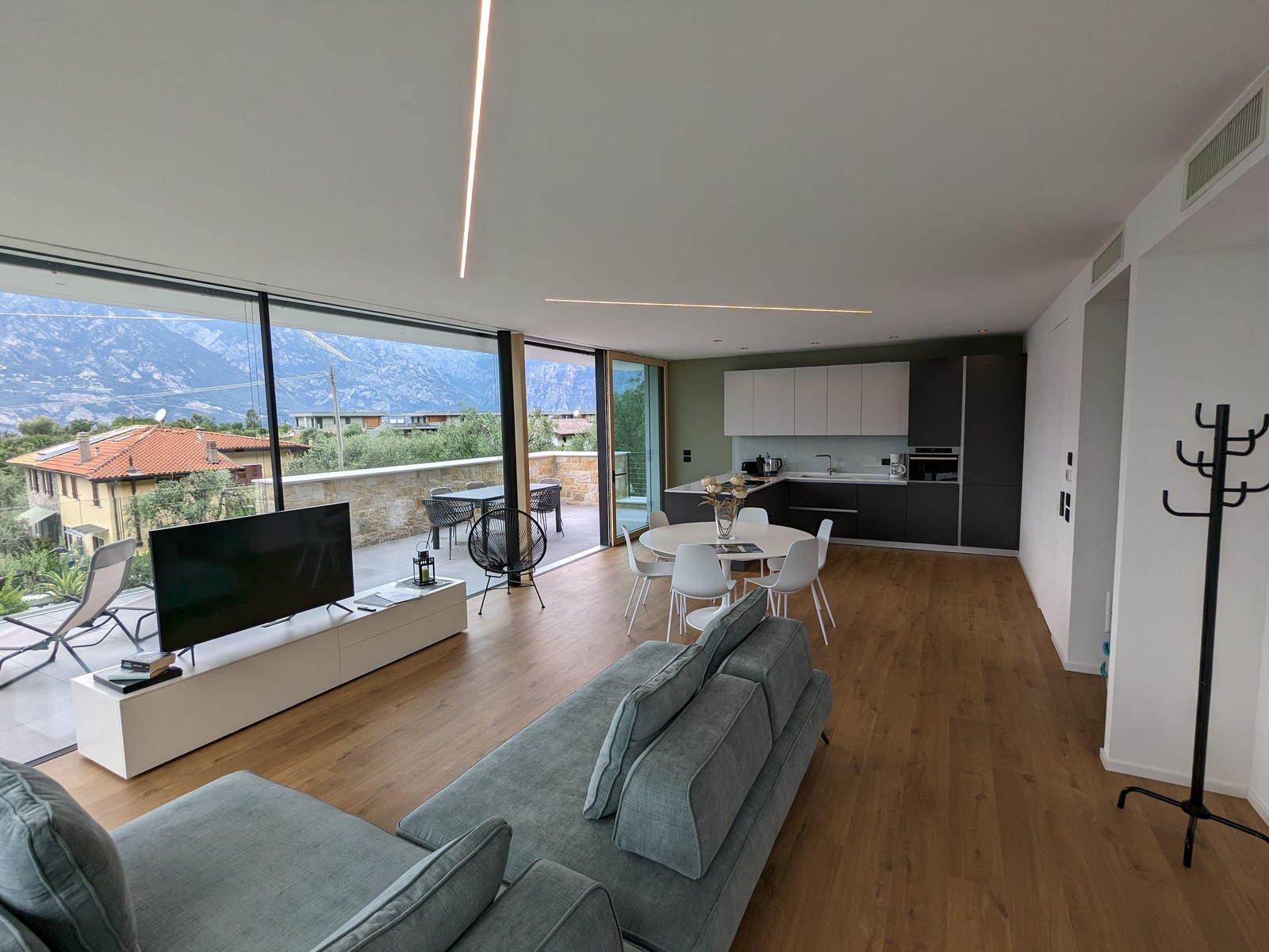 L’appartamento é composto da un’ampia zona giorno con divano letto,2 bagni con doccia, due camere da letto matrimoniale, ampio terrazzo con vista lago di 57 mq